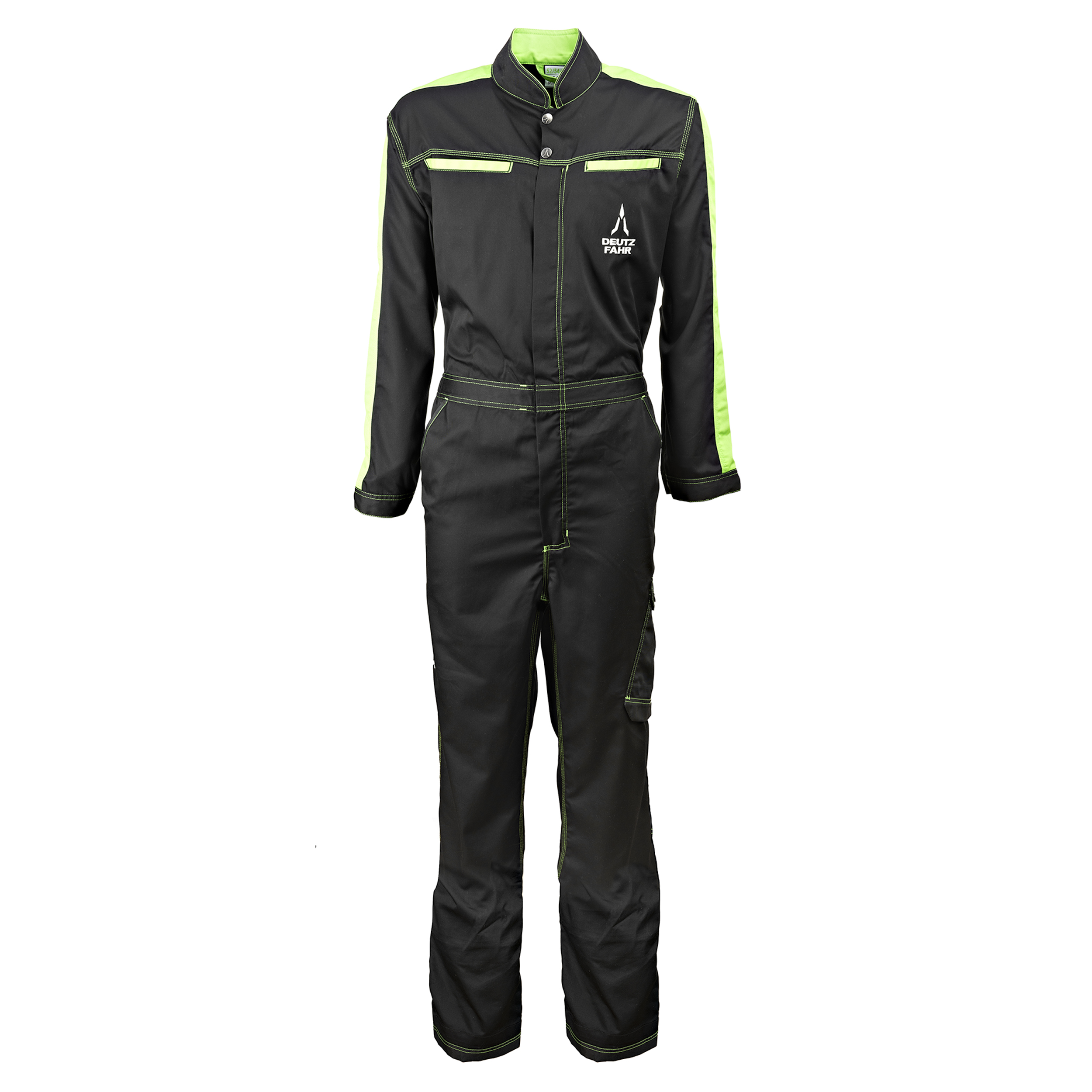 ECO-Arbeitsanzug mit Mandarinkragen aus strapazierfähigem und langlebigem Twill-Gewebe, 200 g/m². Reflektierender Logoprint, vordere, hintere und seitliche Oberschenkeltaschen, Kontrastnähte und zahlreiche grüne Details.